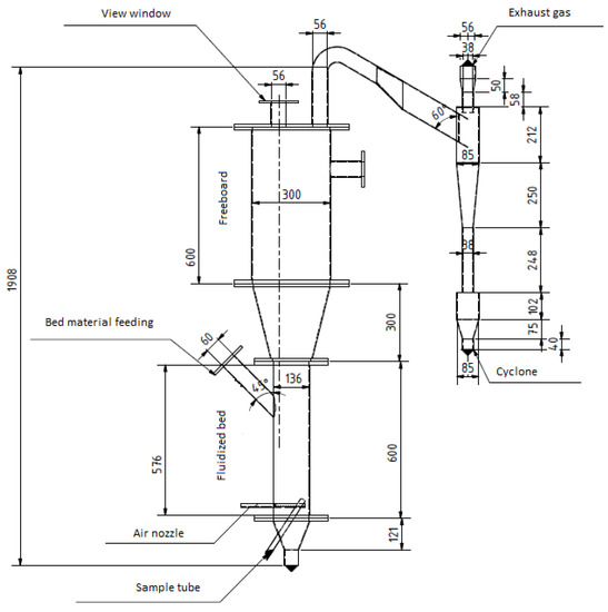 Scheme of the bench-scale bubbling fluidized bed reactor. All dimensions are in mm.