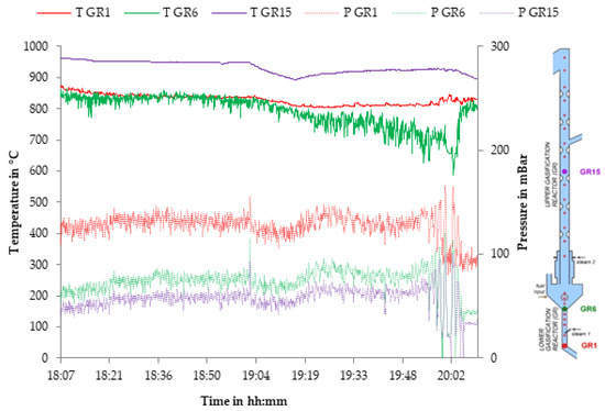 Left: Temperature and pressure measurement of gasification reactor at measurement points GR1, GR6 and GR15. Right: scheme of gasification reactor with the measurement points [23].