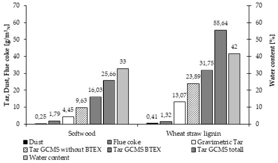 The tar content of the product gas from wheat straw lignin gasification shown in Figure 4 is almost twice as high as in the case of softwood gasification. This originates from the lignin molecular structure, which is composed mostly of aromatic units such as hydroxyphenyl, guaiacyl and syringil [27], and therefore, the tar yield of lignin is considerably higher in comparison to a cellulose- and hemicellulose-based feedstock such as softwood [28]. BTEX (a mixture of benzene, toluene, ethylbenzene and xylene) tars are shown in Figure 4 separately. Both dust and flue coke were measured in the course of the tar measurement protocol described in References [29,30]. In the case of flue coke and dust, the measurement results were within the same range for both cases. These results also correspond well with the experiment with other lignocellulosic fuels performed in the 100 kW DFB gasification pilot [23].
