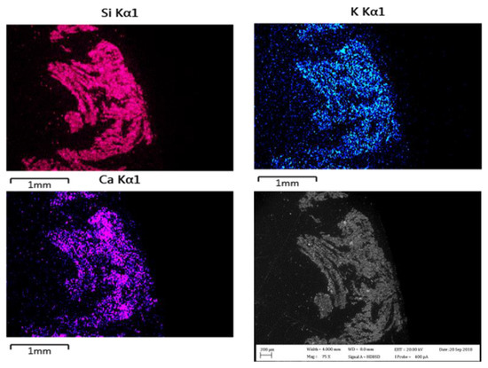 SEM analysis of the ash residues from gasification provides more information about the distribution of individual elements in the particle. As it can be seen in Figure 6, Si and K are uniformly distributed among the ash particles, which could support the reactions between Si and K. As already mentioned in the introduction, these reactions may lead to the formation of low-melting potassium silicates and hence to the melting of ash. Ca is also found throughout the particle, however some areas have higher Ca—concentrations are distinguishable. Even though XRF analysis shows a relatively high Na content (1:1 relation between K and Na), Na could not be detected by EDS analysis. This could be reasoned by an uneven distribution of the element in the samples. Traces of other elements such as P, S, Fe and Cl were not visible in any of the EDS images either.