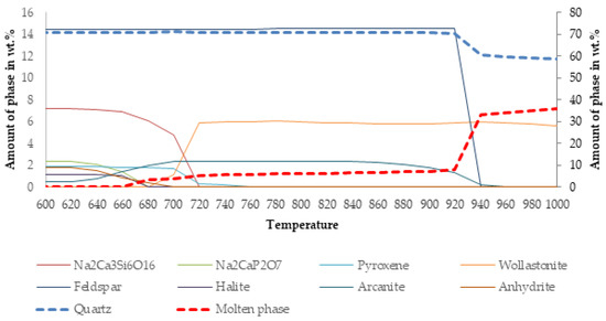 The formation of a melting phase has been predicted by equilibrium calculation performed in Factsage 7.3. Below 660 °C, most of K and Na is present in the form of Na2Ca3Si6O16, Na2CaP2O7, feldspar (KAlSi3O8-NaAlSi3O8-CaAl2Si2O8) and halite (NaCl). The first molten phase is formed above 660 °C, composed mainly of alkali silicates. Molten phase, as well as quartz, is displayed in Figure 8 on the secondary axe (right side), since its amount is considerably higher in comparison to other present phases, which are displayed on the primary axe (Figure 8, left side). Alongside the molten phase, wollastonite and arcanite are formed as well, since Ca and S are due to the decay of the above-mentioned phases available for further reaction. The amount of molten phase increases continuously up to 920 °C. Afterwards, the amount of molten phase is steeply increased from 8 wt.% up to 30 wt.% between 920 and 940 °C, accompanied by the decay of feldspar.