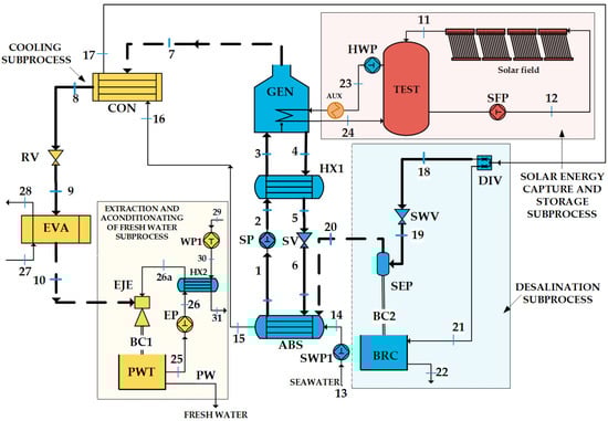The proposed system consists of the coupling of a LiBr/H2O single-effect absorption-cooling open-cycle that has three levels of pressure, with a one-stage flash-desalination process. The system is divided into four subprocesses: (1) the cooling subprocess; (2) the desalination subprocess; (3) the product water extraction and conditioning subprocess, and (4) the solar thermal energy collection and storage subprocess, which are shown in Figure 1.
