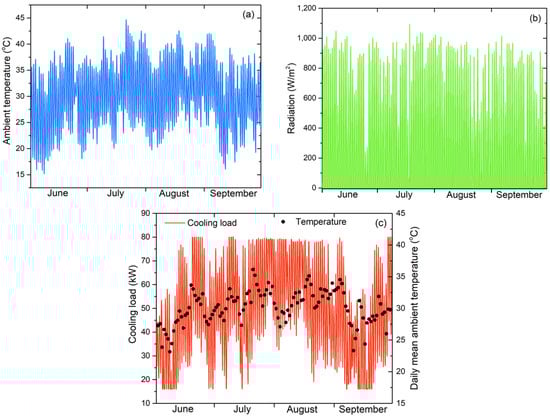 Profile of (a) ambient temperature, (b) global radiation, and (c) cooling demand and daily mean ambient temperature used in the simulation of the solar cooling and desalination system.