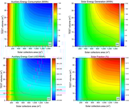 Effect of total solar collector area and total volume of the TEST on (a) auxiliary energy consumption, (b) solar energy generation, (c) auxiliary energy cost, and (d) solar fraction. A fuel cost of $1.15 USD/L and an equivalence of 1 L = 3.79 kWh were considered, considering a conversion efficiency of 38%.