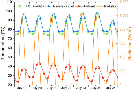 In order to further explore the operation of the solar hybrid system, the week of July 19–25 was selected because it has the highest ambient temperatures during the study period, reaching up to 45 °C in the shade. Figure 6 shows the behavior of the different temperatures that affect the system operation, as well as the horizontal global radiation. The average temperature dynamics of the TEST, as well as the temperature of the fluid entering the system’s generator, can be seen. The stream entering the generator is taken from the top of the TEST, so it has a higher temperature than the average of the TEST. The minimum operating temperature of the cooling and desalination system is 78 °C, so during the day the solar field is sufficient to maintain the TEST temperature above this value. However, as the solar resource decreases, the tank also decreases its temperature due to the continuous extraction of energy, to the point that there is not enough solar energy to maintain the minimum operating temperature, so the auxiliary heater is used and has a constant temperature of 78 °C until the solar resource is sufficient to meet the heating demand.