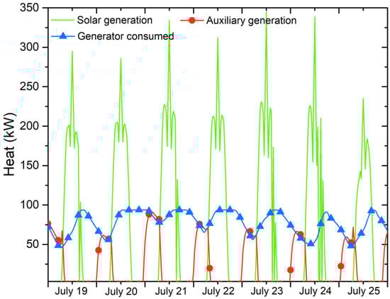 Variation in heat generation of the solar field and the auxiliary heater, and generator power consumption of the cooling and desalination system.