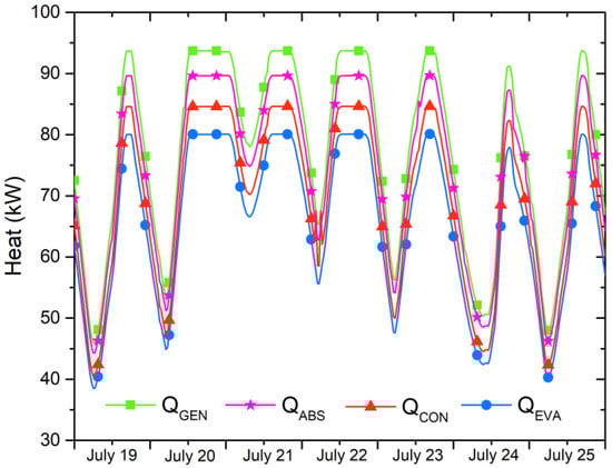 Operational performance of QGEN, QEVA, QCON, and QABS heat exchangers during the critical summer week.