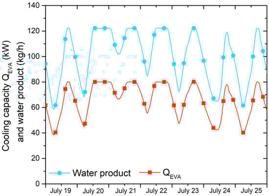 Figure 9 shows the heat transfer in EVA and fresh water production during the critical summer week. It can be seen that the increases in cooling capacity and fresh water production are proportional. This is because, as mentioned above, in order to meet the demand for cooling, it is necessary to control the production of steam (7) and bring it into the EVA to provide the cooling effect. This coolant flow, when suctioned by the ejector, is converted into product water, therefore, if the cooling capacity is increased, the product water also increases. The system operating at its maximum cooling capacity can satisfy a demand of 80 kW and a water production of 122 kg/h. During the week analyzed, a total production of 16.94 m3 was reached—while the average daily production of 2406 kg/day—enough to satisfy the daily water requirements of four people in a coastal hotel in Mexico [38] or to cover the basic services of 24 people according to World Health Organization (WHO) [39].