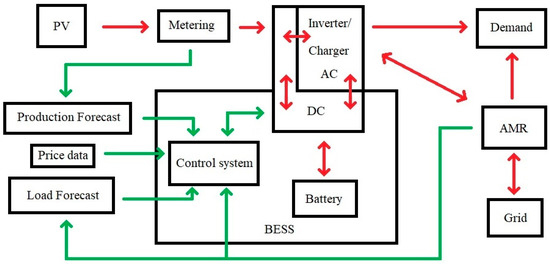 - This study is based on simulations using ordinary household customers’ demand data, with BESS added to the households’ electricity system. The simulation model is presented in Figure 1, which shows the directions of power flow and information data flow with red and green arrows, respectively. In the basic situation, PV power flows through the metering to the inverter, where it can go straight to the household to meet demand or to the BESS, and if the amount of produced energy is higher than the demand and the storage capacity is full, it can be fed to the grid and measured by automatic meter reading (AMR). If PV production cannot meet the energy need, it can be taken from the grid to meet the demand or to the BESS.