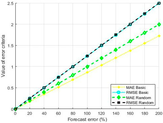 Mean absolute error (MAE) and root mean squared error (RMSE) are the best criteria for comparing the validity of the load forecast, and are used in the control of residential BESS [9]. In the random method, forecast errors are made by the random function in MATLAB® R2018a by Matworks, so MAE and RMSE increase linearly, similar to the basic method. For ideal forecasting, normally distributed random errors are added, whose mean is zero and standard deviation increases 0.25 kW per 20%. With these parameters, RMSE is the same as in the basic method and MAE is also very close, as we can see from Figure 2.