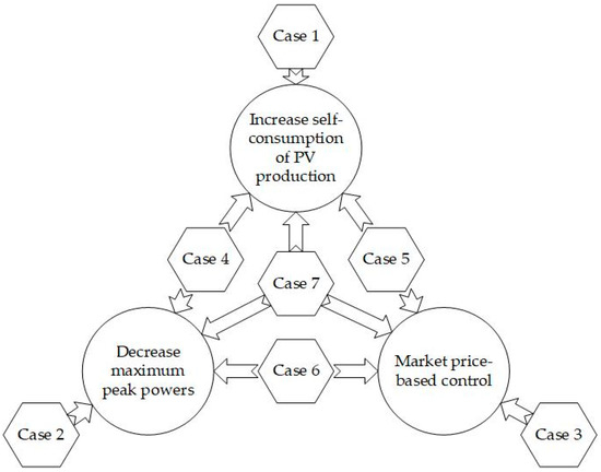 The effect of load forecasting was studied with different cases. There are three control targets, and all combinations of them were studied. The study cases are presented in Figure 3. The three basic control targets form study cases 1–3. These three basic targets are introduced earlier in Section 2.1., and in more detail: the case 1 in Section 2.1.1., the case 2 in Section 2.1.2., and the case 3 in Section 2.1.3. Cases 4–6 are the combinations of two of the basic targets and study case 7 is the combination of all targets. Combining of cases are introduces in Section 2.1.4. These seven cases are selected, because cases include all combinations, which make it possible to obtain cost savings for customers.