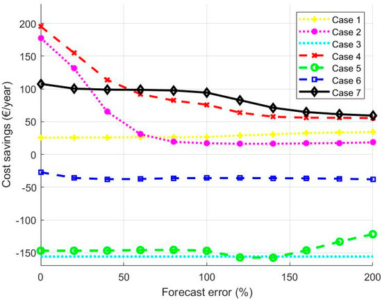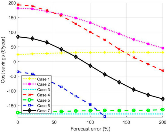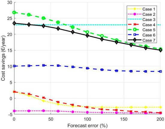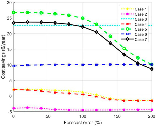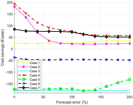 When cases 1 and 2 were combined in case 4, the accuracy of the load forecast had a strong effect on the cost savings. Improving the load forecast increases cost savings significantly. In case 6, the load forecast must be very accurate after the improvement increases the cost savings. When all control targets are involved in case 7, the accuracy of the load forecast is very important around the 100% forecast error, but below 60% or over 140% the cost savings are stable. It is an important observation that with the current load forecast (100% forecast error), case 7, using all control targets, gives the highest cost savings.