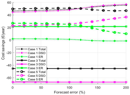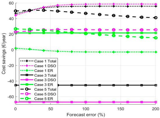 Figure 11. Cost savings in function of forecast error with general distribution tariff using random method of load forecast error modeling in cases 1, 3 and 5.