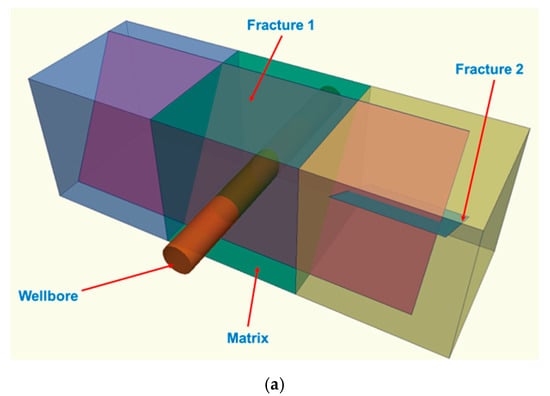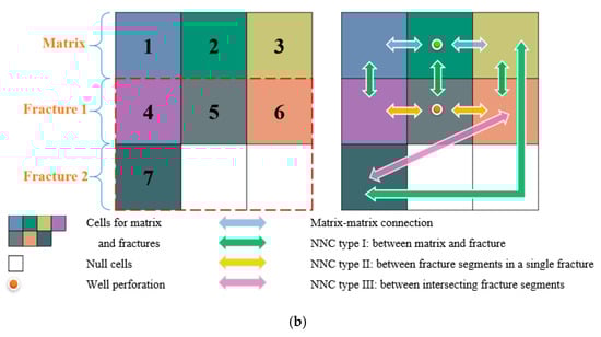 The non-intrusive EDFM method is an efficient way to accurately model the flow behavior of complex fracture networks, which was originally developed by [25,26,27]. The schematics are shown below, conceptually demonstrating the mechanism of the non-intrusive EDFM method (Figure 1). As shown, two fractures are explicitly embedded into three matrix cells in the computational domain and four additional fracture cells were generated in the computational domain to represent these two fractures. Three types of non-neighboring connections (NNCs) were proposed to include the flow connections between the matrix and fractures, between the fracture segments in a single fracture, and between the intersecting fracture segments [25]. These cells contain modified information, such as permeability, porosity, transmissibility, and relative permeability specifically for the direct characterization of these media. Structured matrix cells can be used together with additional fracture cells to easily handle 3D complex fractures. More details of NNC calculations and validations can be found in [25]. One advantage of the non-intrusive EDFM method is that it introduces a smaller number of total cells and NNCs to reduce the computational time when compared to the traditional local grid refinement method. Another advantage is that the non-intrusive EDFM method can be easily applied in any third-party reservoir simulator to model complex fractures.