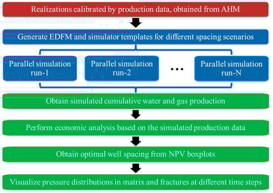 The following flow chart (Figure 2) demonstrates the steps of the well spacing optimization workflow. First of all, it was necessary to obtain the accurately characterized combinations of uncertain parameters in the shale gas reservoir that were validated by the known production history. This could be achieved by AHM. These combinations were not generated randomly, but are rather the samples from the true posterior distributions of uncertain parameters after AHM. For more details regarding the AHM, please refer to the work by [24], in which the AHM concept is elaborated in detail. A total of 100 combinations of uncertain parameters, such as the matrix petrophysical properties, hydraulic fractures’ geometry and properties, as well as the natural fractures’ geometry and properties were selected as input for the well spacing optimization workflow.