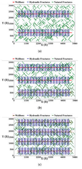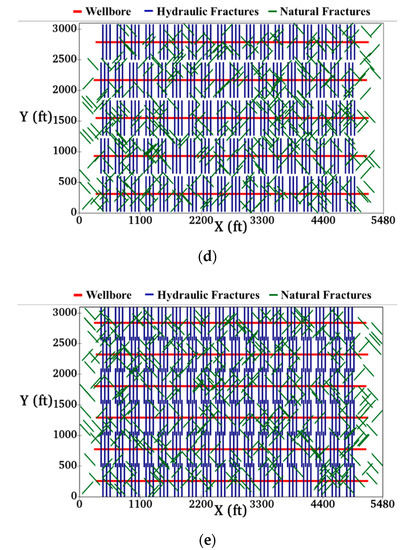 A field-scale shale gas model with multiple horizontal wells and complex hydraulic and natural fractures: (a) a two-well spacing of 472 m (1550 ft); (b) a three-well spacing of 315 m (1033 ft); (c) a four-well spacing of 236 m (775 ft); (d) a five-well spacing of 189 m (620 ft); and (e) a six-well spacing of 158 m (517 ft).