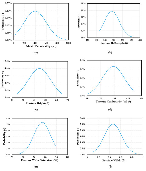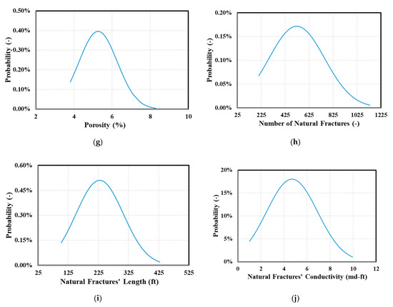 Distributions of the combinations of uncertainty as the inputs of the well spacing optimization workflow, generated from the AHM: (a) the matrix permeability distribution; (b) the fracture half-length distribution; (c) the fracture height distribution; (d) the fracture conductivity distribution; (e) the fracture water saturation distribution; (f) the fracture width distribution; (g) the matrix porosity distribution; (h) the number of natural fractures’ distribution; (i) the natural fractures’ length distribution; and (j) the natural fractures’ conductivity distribution.