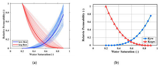 Relative permeability curves for the shale gas simulation with the two-phase flow: (a) the uncertainty distribution obtained from the AHM [24]; and (b) the best match result extracted from all the realizations of AHM.