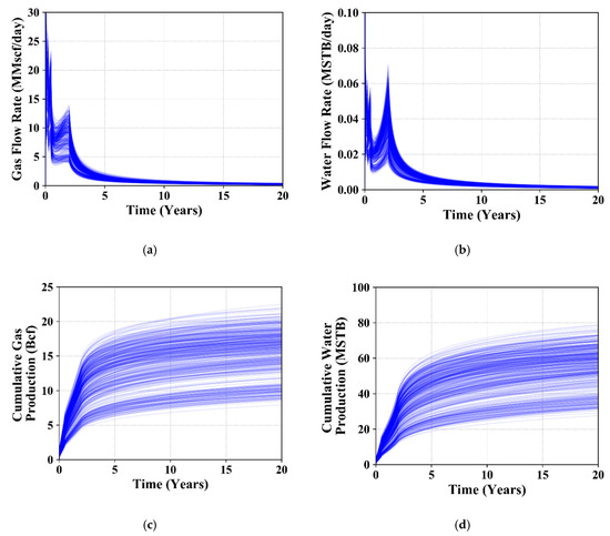 Gas and water flow rates and the cumulative gas and water production of all 500 simulation cases for the 5 different well spacing scenarios: (a) the gas flow rate; (b) the water flow rate; (c) the cumulative gas production; and (d) the cumulative water production.