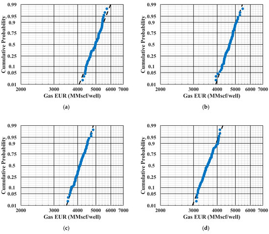 Estimated ultimate gas recovery per well for the different well spacing scenarios (EUR represents estimated ultimate recovery and MMscf represents million standard cubic feet): (a) the two-well spacing of 472 m (1550 ft); (b) the three-well spacing of 315 m (1033 ft); (c) the four-well spacing of 236 m (775 ft); (d) five-well spacing of 189 m (620 ft); and (e) the six-well spacing of 158 m (517 ft).