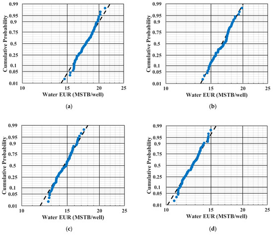 Estimated ultimate water recovery per well for the different well spacing scenarios (MSTB represents thousand stock tank barrel): (a) the two-well spacing of 472 m (1550 ft); (b) the three-well spacing of 315 m (1033 ft); (c) the four-well spacing of 236 m (775 ft); (d) the five-well spacing of 189 m (620 ft); and (e) the six-well spacing of 158 m (517 ft).