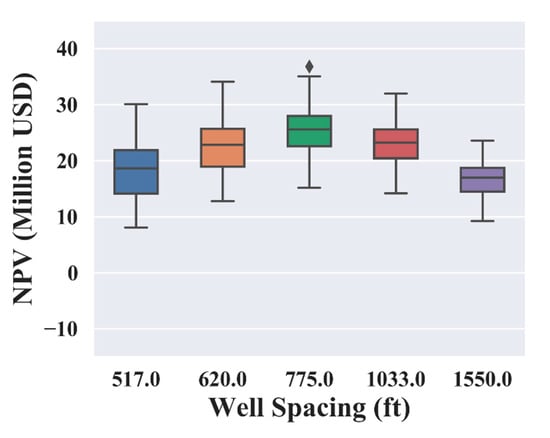 Then, the NPVs of all the runs were calculated based on a well cost of USD 8.0 million, as shown in Figure 10. The gas price was modeled using 1.8 dollars per Mscf. The gas tax rate was set at 6% and the miscellaneous tax rate was set at 5%. Water disposal cost was 0.6 dollars per barrel and the discount rate was 12%. All the NPVs (calculated by the equations in the methodology section) were collected for each scenario and the distributions of this economic performance was presented as box-plots in Figure 10. The box-plot is a classical method to directly and effectively represent any distributions in the data analysis field. The x axis is usually categorical and discrete, representing the scenarios or the intervals that independent variables fit. The y axis is the interested response value and is usually continuous. There are specific meanings to the geometry of the box-plot. The lower bar with a horizontal line is the minimum observed value, the lower edge of the box is the P25 (first quartile) of the observed values, the middle bar in the box is the P50 (median), the upper edge of the box is the P75 (third quartile), and the upper bar with a horizontal line is the maximum observed value. Sometimes, there are points outside the described geometry, which are classified as the outliers. The detailed information regarding the P25, P50, and P75 values is tabulated in Table 5.