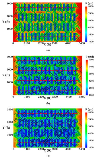 After determining the optimal well spacing of four wells per section with a spacing of 236 m (775 ft), it would be insightful to visualize both the short-term (1 year and 5 years) and long-term (10 years and 20 years) pressure distributions in the matrix and fracture, respectively, as shown in Figure 11 and Figure 12, in which the drainage efficiency can be clearly observed. As can be seen, the natural fractures further away from the wellbore do not contribute to the drainage in the early production period (less than 10 years). However, the effect of natural fractures on the pressure drawdown becomes more pronounced after 20 years of production. In addition, pressure drawdown in the hydraulic fractures is very fast, since it reached bottomhole pressure in less than 5 years, implying that the hydraulic fractures play a more important role in contributing to production than natural fractures, except the ones that are intersected by the hydraulic fractures near the wellbores.