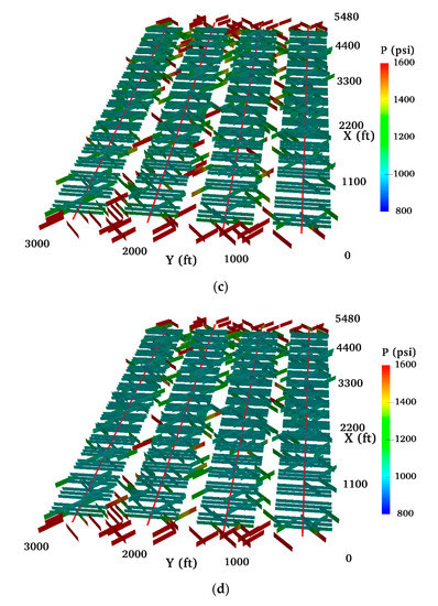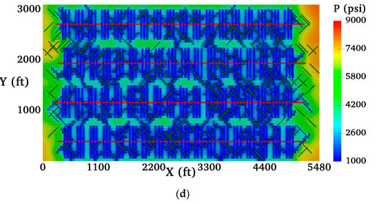 Pressure distributions in the fractures for the optimal well spacing scenario: (a) after 1 year; (b) after 5 years; (c) after 10 years; and (d) after 20 years.