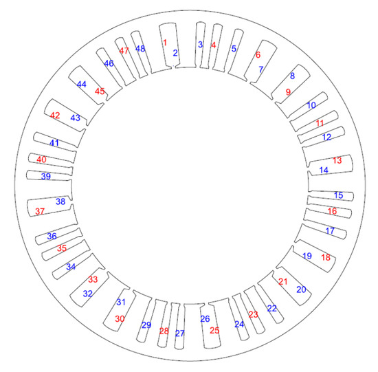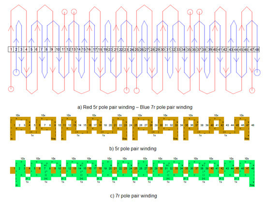 The schematic windings is reported in Figure 4a, by using different colors: the red line represents the winding which has the same pole pairs of 5r MMF space harmonic, while the blue line is the 7r pole pair winding. Both windings are also sketched in Figure 4b,c, respectively. These latter two sub-figures report also the number of turns that form each coil and the connection between two adjoining coils.