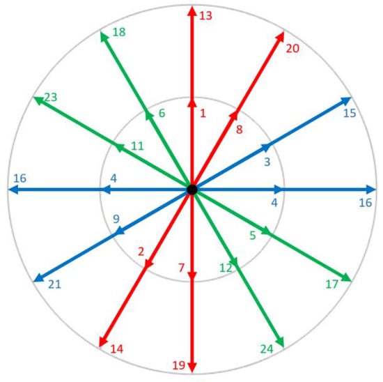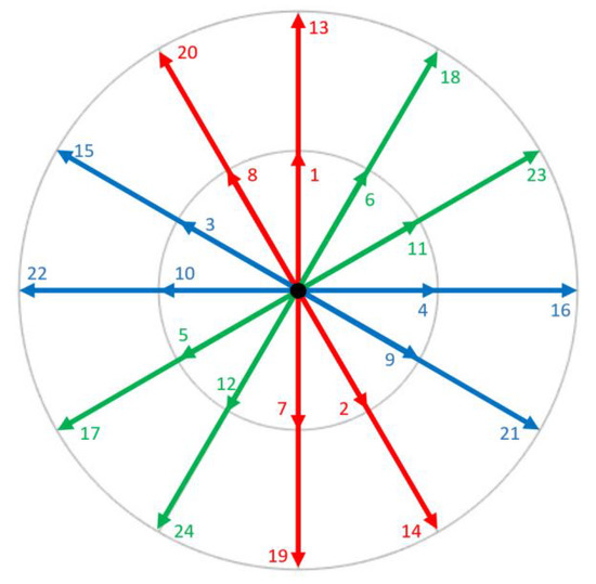 The schematic of the windings is in Figure 2. Of the many possible configurations of the stator windings, a concentrated winding with 24 slots has been chosen, because it provides two dominant harmonics that can be linked to the two windings with different rotor poles. Unfortunately, other MMF harmonics are present, whose effect is to deform the induced EMFs. From Figure 2, it is clear that the winding is composed by an elementary section, comprising slots 1–12, which repeats identically two times.