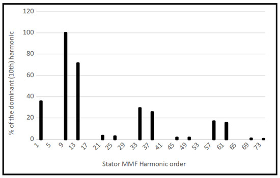 The FFT analysis of the MMF is shown in Figure 8. As the winding is composed by an elementary section that repeats identically two times, the first significant MMF harmonic has four semiperiods in the airgap. However, the winding provides two significant dominant harmonics (i.e., the 10th and the 14th bars in Figure 8), which are exploited to provide the torque.