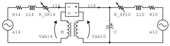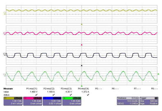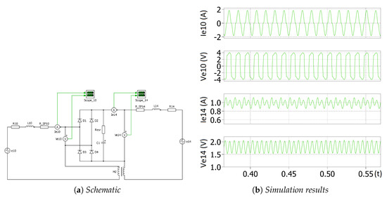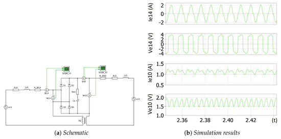 As in the previous Figure 13a,b, the simulated voltages and currents of induced and excitating windings are reported; indeed, this time Ve10 and Ie10 are the induced voltage and current, while Ve14 and Ie14 are the rectified ones.