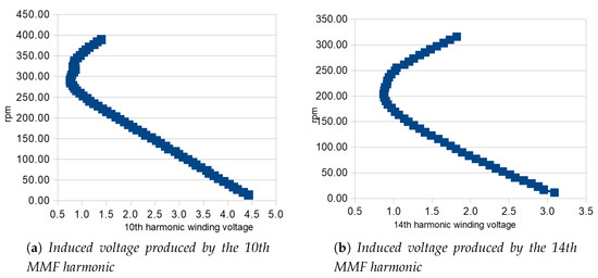 In Figure 17a, the experimental results referring to the rotation in the direction of the 10th harmonic (synchronous speed rpm) are shown. Figure 17b shows the experimental results relevant to the rotation in the direction of the 14th harmonic. In this case, the synchronous speed is rpm. In Figure 17a,b, the synchronous speed is identified by the minimum of the induced voltage. The higher the voltage, the farther the speed from synchronism. The trends are quite in agreement with Equation (9), where and drop to zero at synchronous speed, while the other components remain.