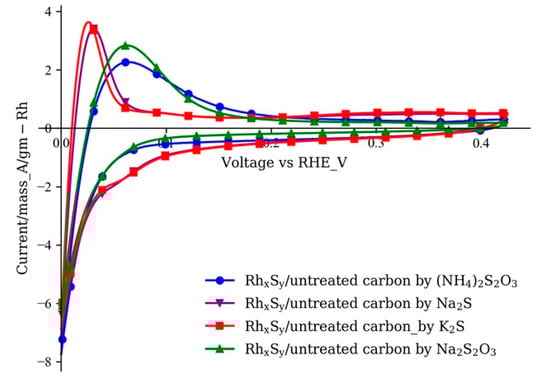 In the rhodium sulfide synthesis reported in the previous publications [,,,] and in the patent by De Nora [], the source of rhodium was the RhCl3 solution, and the source of sulfur was provided by the dissociation of (NH4)2S2O3 []. In this study, a new type of sulfur source, Na2S, was used to provide the sulfide ions in the synthesis of RhxSy. In the first part of the study, the new sulfur source was used to synthesize rhodium sulfide catalysts on the untreated commercial carbon substrate XC72R. Besides the different sulfur sources, the same thermal treatment temperature and ramp rates as those of the catalyst with (NH4)2S2O3 were used. An interesting fact that the RhxSy catalyst with Na2S as the sulfur source (purple curve with downward triangle markers) is more active than the catalyst synthesized with (NH4)2S2O3 can be found in the cyclic voltammogram in Figure 1. The RhxSy/untreated carbon synthesized by Na2S shows a lower overpotential for the HOR as compared to those of the RhxSy/untreated carbon with (NH4)2S2O3 (blue curve with circle markers), indicating that the usage of Na2S is a potential approach to increase the HOR activity of rhodium sulfide catalyst.