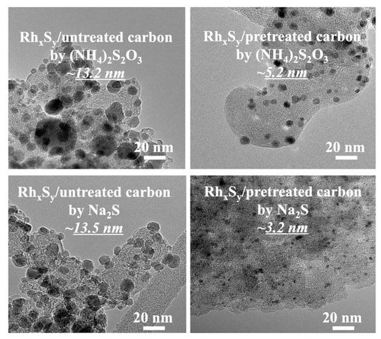 The linear polarization results in Figure 2b show that the active-area-specific HOR/HER activities of the rhodium sulfide catalysts synthesized with Na2S on the untreated/pretreated carbons are higher (i.e., lower vs. I slopes) than those of the catalysts synthesized with (NH4)2S2O3, validating the CV results presented in Figure 2a. Since the current density used in Figure 2b is the current per ECSA of the catalyst, the exchange current density io here is the ECSA-based exchange current density. By multiplying the mass-specific ECSA obtained in Figure 1, the mass-specific exchange current density io* can be calculated. The HOR/HER active-area-specific activities of the RhxSy catalysts made with Na2S are 1.2 times (0.56 A/cm2 vs. 0.47 A/cm2) and 1.3 times (0.81 A/cm2 vs. 0.62 A/cm2) those of the RhxSy catalysts made with (NH4)2S2O3 on untreated and pretreated carbon substrates, respectively. It is also worth noting that the higher activity of the RhxSy catalysts obtained with Na2S is not affected by the slow addition rate of the sulfur source solution and the types of the carbon substrate. The decrease in the NPs size by the application of functionalized carbon and the mass-transportation-controlled nanoparticle growth process using the slow sulfur source addition rate approach is confirmed by the TEM micrographs in Figure 3. With this combined approach, the average particle size of the RhxSy/pretreated carbon synthesized with (NH4)2S2O3 decreases to 5.2 nm, while that of the RhxSy/pretreated carbon synthesized with Na2S decreases further to 3.2 nm with a lower sulfur source addition rate.