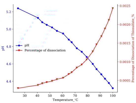 Compared to the direct dissociation of Na2S, the two-step dissociation of (NH4)2S2O3 releases sulfide anion slowly. Since the dissociation of S2O32− releases H+, the level of S2O32− dissociation can be determined by measuring the pH of the solution. Two H+ cations are released per dissociated S2O32− in the equation above. Figure 6 shows the dissociation level of (NH4)2S2O3 versus the temperature. The results show only 0.0025% of S2O32− dissociated when the solution was heated from room temperature to the reaction temperature of the Rh2S3 precursor synthesis process (100 °C). It can be inferred from these results that the dissociation of thiosulfate in the synthesis of Rh2S3 is driven by the consumption of sulfide ions by the precipitation with Rh3+. The equilibrium of the dissociation reaction of thiosulfate is continuously driven forward by the Rh3+ sulfidation reaction. In our synthesis process, 20% excess sulfur source was used to precipitate all of the expensive precious rhodium. At the end of the precursor synthesis process, the extra S2O32− exists mostly in the form of S2O32− instead of S2−. On the other hand, the Na2S dissociates completely and quickly. Consequently, the extra Na2S stays in the S2− form after the complete sulfidation of Rh3+. The extra S2− may be either left on the precursor surface or incorporated into the amorphous Rh2S3 particles, due to its small size and affinity with the coordinated sulfur atoms in the precursor. Since RhxSy is a type of heterogeneous catalyst which only catalyzes the reactions on the surface, the crystal phase composition on the catalyst surface determines the catalytic activity. Although most of the extra S2− may be removed during the catalyst preparation, the residue of the extra S2− in the particles should still be enough to modify the catalyst phases on the surface.