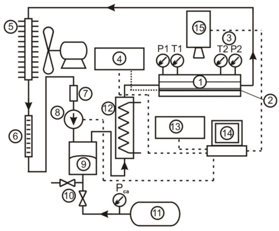 Flow loop. 1—Measurement module with the minichannel (details in Figure 3), 2—Heating copper block, 3—Temperature and pressure sensors, 4 DC power supply, 5—Cooler with ventilator, 6—Rotameter, 7—Filter, 8—Pump, 9—Pressure control, 10—Compressed air valves, 11—Compressed air tank, 12—Preheater, 13—Facility control unit, 14—Computer for experiment control + LabView software, 15—High speed camera, Pca—Compressed air pressure sensor.