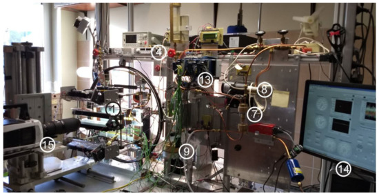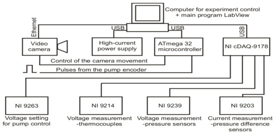 In the experimental runs, it was necessary to record large numbers of data of various types. Those included video camera images of two-phase flow structures and numeric data of copper block and flowing fluid temperature, fluid pressure and volume flux. Data collection was done by the modular measurement-control system, Figure 4. The core of it was NI cDAQ-9178 chassis (National Instruments) that holds dependent modules, controlling both the measurements of boiling process parameters and the component assemblies, such as the pump, camera triggering, etc.