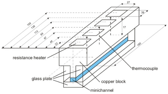 Copper block with attached glass minichannel and location scheme of resistance heaters and thermocouples—Transverse section and axonometric view; dimensions in mm (pictorial view, not to scale).