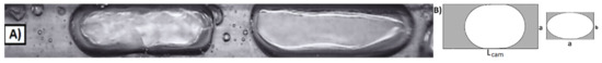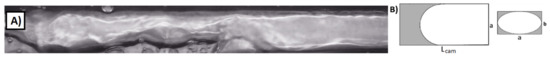 (A) Actual and (B) approximated shapes of vapor bubbles in longitudinal and transverse sections of the channel with flow direction, case II. Water, Tin = 55.2 °C, Tout = 125.9 °C, pin = 1.0697 bar, Δp = 0.0016 bar, q = 260.1 kW/m2, G = 8.6 kg/(m2 s), Re = 66.9, Lcam = 20 mm