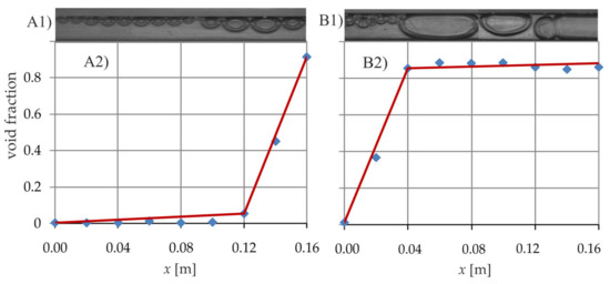 At the same time, flow boiling in the minichannel was filmed using high-speed video camera and local void fractions φ(x) were measured on the basis of recorded images. The scripts developed in Section 2.2 allowed the calculation of the void fraction for each pattern of two-phase flow structures observed in this study. The experimental local values of the void fraction, measured along the minichannel length, were approximated with broken lines, as shown in Figure 11.