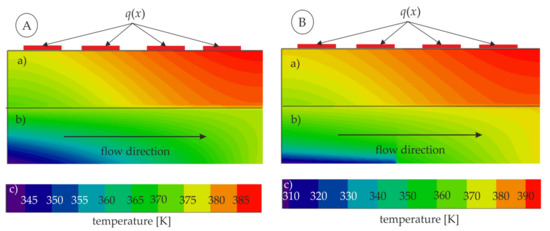 Two-dimensional temperature fields of (a) the copper block and (b) flowing fluid obtained by the Trefftz method for (A) heat flux q = 223.2 kW/m2 and mass flux G = 5.9 kg/(m2 s) and (B) heat flux q = 340 kW/m2,mass flux G = 5.9 kg/(m2 s), (pictorial view, not to scale).