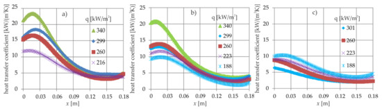 Variation of the heat transfer coefficient for the flowing two-phase mixture is shown in Figure 13 as the function of the distance from the minichannel inlet. It is presented for three selected mass fluxes and varying heat flux. The heat transfer coefficient decreases as the distance from the inlet grows, which is related to increasing void fraction. Some variation in this trend can be observed both at the channel inlet and outlet. The growing heat flux also increases the heat transfer coefficient. Analysis of graphs in Figure 13 shows a known pattern—an increase in flow intensity causes an increase in heat transfer coefficient.