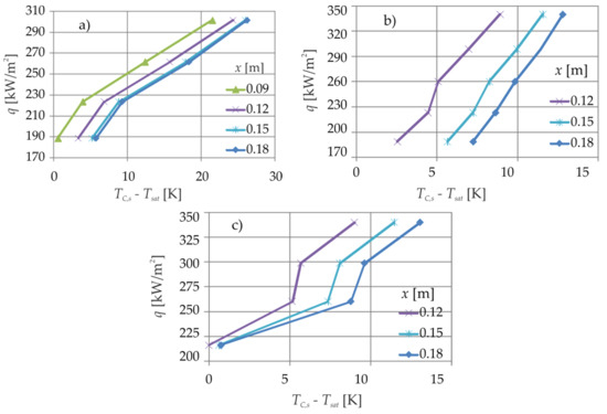 The shape of boiling curves presented in Figure 14 for various distances from the minichannel inlet is similar to the initial section of standard boiling curve. The curves originate with segments of steep dependence of the heat flux q versus the temperature difference TC, s − Tsat and flatten with further increase of that difference. This results from the growing vapor phase (void fraction) and approaching first boiling crisis. In the discussed experiment, the vapor was not superheated to prevent possible thermal damage of the research facility. Therefore, the boiling curves are limited to their initial segments.