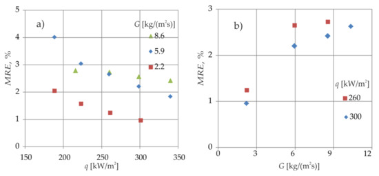The uncertainties of the experimental parameters determined in study [2] were applied to calculate the mean relative error (MRE) of the heat transfer coefficient α (x). Figure 15 shows the MRE as a function of both heat flux and mass flux. When the heat flux supplied to the copper block increases, the MRE decreases from the value of 4.2% for heat flux q = 188 kW/m2 down to 1.0% for q = 340 kW/m2. For smaller mass fluxes, the MRE values are lower.