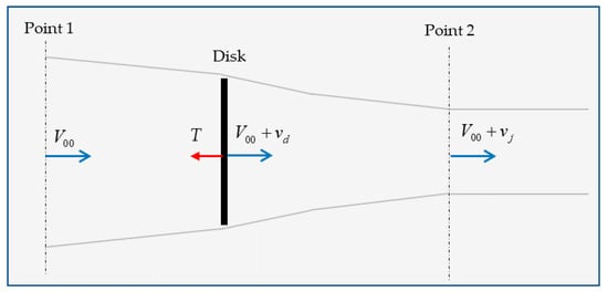 The propeller is considered as an actuator disk, which is a disk with infinitesimal thickness. The thrust is uniformly distributed along the disk and during the rotation, an instantaneous pressure variation acts through the disk. With the ideal condition that no air stream rotations are introduced by the disk, is obtained that the pressure at the Point 1 is equal to the pressure in the Point 2 []. Using the concept of flux tube, the thrust on the disk can be calculated in two ways:
