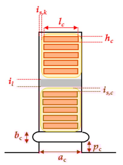 The parameters is,c, is,k, and il depend on the type of insulation and their values are below 1 mm. The wedge thickness and the slot opening are not modified with respect to the reference motor, and in our case are both 1 mm. Besides the ac depends on the internal diameter of the motor (equal to ) and by the maximum value of magnetic flux density inside the tooth.