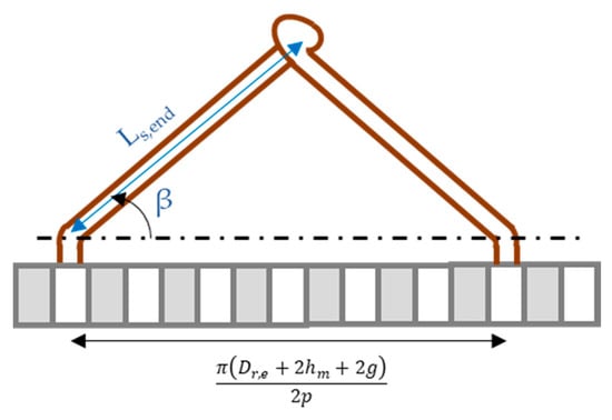 The angle β also depends on the manufacturer’s quality and in our case is fixed at 45°. A safety factor of 1.2 is adopted in the calculation. The mass of the end windings are calculated as: