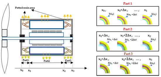 where Tend-wind and Twind are the maximum temperatures calculated though the 2D FEA in the end-windings and in the windings inside the magnetic stack, while Tmag is the maximum temperature in the magnets. The Tmax,wind and Tmax,mag are the limit temperatures imposed by the insulation class and the type of magnets adopted. In order to apply the 2D FEA, the length of the machine is divided into three parts; Figure 4: the two parts related to the end-windings (the first part x0–x1 is near the propeller, the other one is on the opposite side x2–x3) and the last part is the magnetic stack length (x1–x2). The three parts are further discretized with step Δx along the axial direction in order to consider the variation of heat exchange coefficient along the external surface. For each disk obtained, the local heat exchange coefficient is calculated according to the Nusselt number [,].