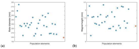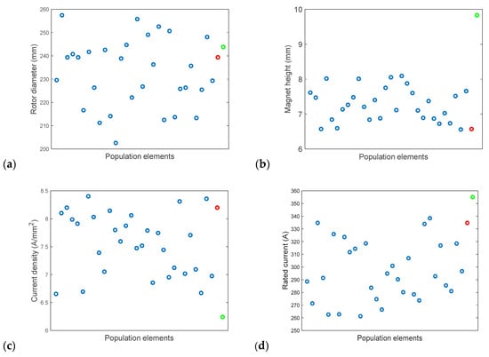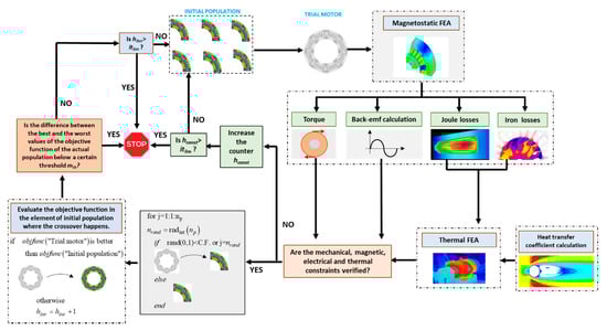As previously described, the design of a propulsion motor for hybrid/full electric aircraft is quite complex with respect to an industrial motor for the thermal problem and the necessity to reduce the weight. The greatest part of the propellers used in aircraft have a hydraulic system able to modify the angle pitch and keep the angular speed of the propeller constant. The constant speed (or a strict variation speed range) is an advantage in the design of propulsion motors with respect to the traction application [] where a good performance in terms of efficiency must be guaranteed in a large range of angular speeds. The optimal solution for a propulsion motor can be obtained using a multiphysics approach, able to merge the magnetic and thermal problems at the same time. A precise and affordable solution can be obtained with finite element analysis (FEA), both for the magnetic and thermal analyses. As it is well-known, the FEA needs a high computational cost and a large simulation time, but it is feasible for solving an optimization problem by means of heuristic optimizations able to reduce the number of iterations required for the evaluation of a cost function under given constraints. One of the most adopted methods is based on the differential evolution (DE) algorithm [], which is proposed in many variants and used in the field of electrical machines [,]. The DE algorithm starts from an initial population of a certain number of electric motors with similar characteristics, which can be generated randomly or using the value of existing motors. In our cases a mixed method is applied. Starting from an existing electric motor with the same rated speed and with a similar rated power, and self-ventilated cooling. As it will be shown in the next paragraph, the proposed optimal design methodology is based on a low number of considered design variables. This is due to the necessity of reducing the computational cost: therefore, the use of some characteristics inherited from existing machines appears necessary. In particular the magnetic stack length, the magnet pole arc, the number of slots (Q), and the number of turns per pole and per phase (Ns,p) are maintained fixed and extracted from the existing motor.